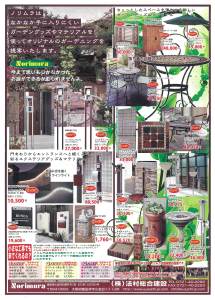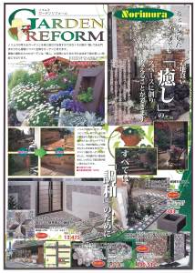 2014年夏のチラシはガーデンリフォーム特集です。 素敵な庭にしたいけれど、どこから手を着けていいか分からない…。 そんなお悩みも、ちょっとした工夫とオシャレなアイテムで平凡なお庭が建物と調和した素敵な空間に生まれ変わります。 ぜひ一度、ノリムラにご相談ください! ご相談・お見積りは無料です。しつこい営業もいたしません。